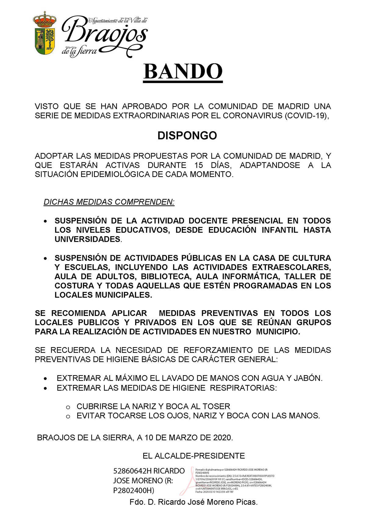 Tablón Municipal Tablón Municipal 10 marzo 2020 Visto: 1761 Bando referente a las medidas extraordinarias en el municipio 000s2smodern share tweet